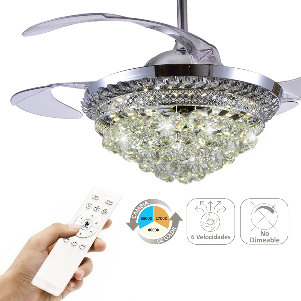 Cuatro aspas retráctiles invisibles cuando no esta en funcionamiento. Proporciona viento suave natural, motor silencioso, 6 velocidades diferentes, además cambia entre tres tonos de color neutro, blanco y cálido desde el control remoto.