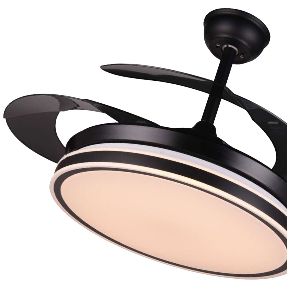 Cuatro aspas retráctiles invisibles cuando no esta en funcionamiento. Proporciona viento suave natural, motor silencioso, 6 velocidades diferentes, además cambia entre tres tonos de color neutro, blanco y cálido desde el control remoto.