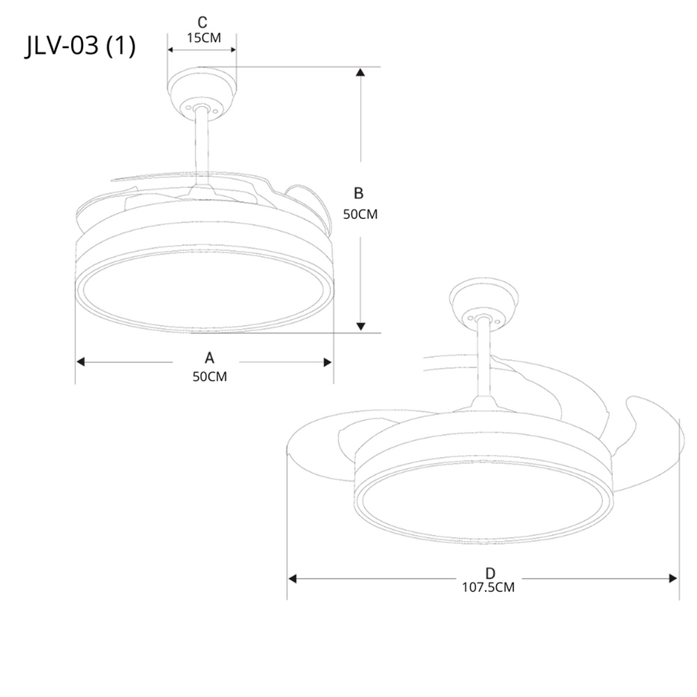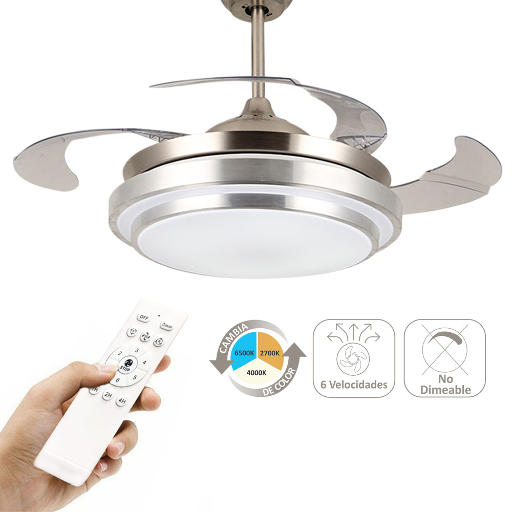 Cuatro aspas retráctiles invisibles cuando no esta en funcionamiento. Proporciona viento suave natural, motor silencioso, 6 velocidades diferentes, además cambia entre tres tonos de color neutro, blanco y cálido desde el control remoto.